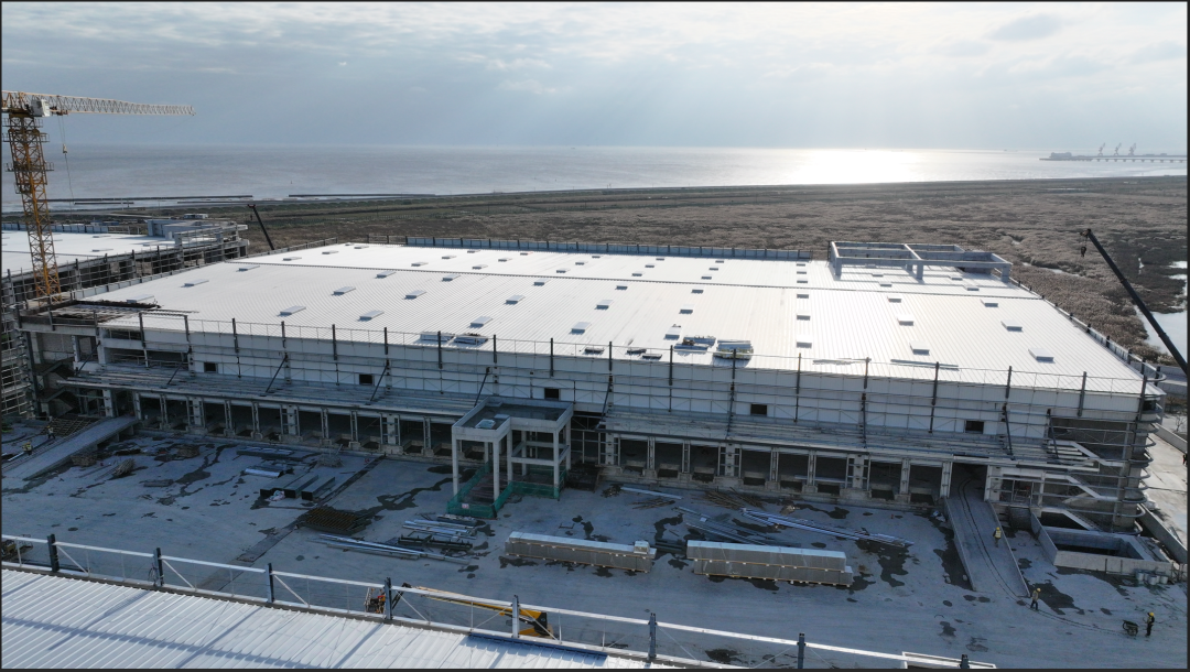 濟寧一建鋼結(jié)構(gòu)工程有限公司承建的金屬屋面及維護工程,涉及1#-4#物流倉庫、高架立體庫。倉庫跨度80米,屋面標高34.1米,為雙向找坡結(jié)構(gòu)。該項目建設(shè)規(guī)模大、工期緊、技術(shù)精度要求高、工況復(fù)雜,自項目開始施工。公司對現(xiàn)場管理嚴格要求,積極配合業(yè)主及總包的整體調(diào)配,施工嚴格執(zhí)行施工方案,遵循規(guī)范標準,合理安排人、機、料等,戮力同心將馬士基臨港旗艦倉項目打造成精 品工程、優(yōu) 質(zhì)工程。